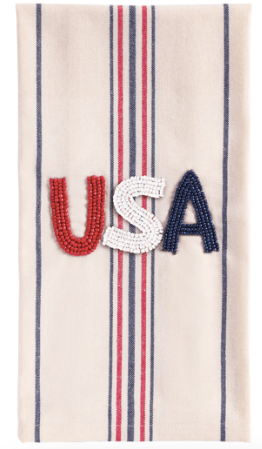 Flag Beaded Americana Towel. This exquisite yarn-dyed cotton hand towel features intricately beaded icons that celebrate the spirit of Americana. The vibrant design and high-quality materials ensure it remains a standout piece in your home decor, adding a touch of patriotic charm to any bathroom or kitchen setting. Ideal for those who appreciate unique and stylish home accessories, this towel combines functionality with a decorative flair.