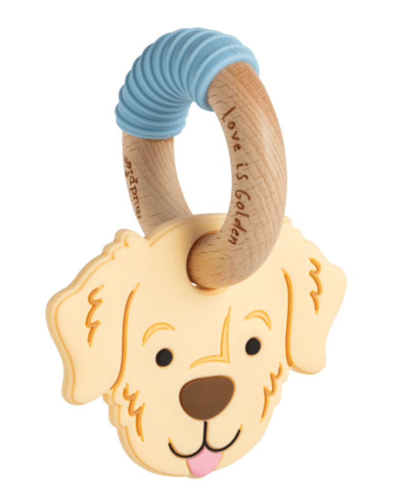 These doggie teethers offer a soothing solution for your little one's teething discomfort. Crafted from natural beechwood and BPA-free silicone, this teething ring ensures safety and durability. Designed for ages up to 18 months, it provides a perfect fit for tiny hands to grasp and chew. Measuring approximately 3" x 3 1/2", its compact size makes it easy to carry and ideal for on-the-go relief. The combination of textures helps massage sore gums, promoting healthy oral development while engaging your baby's senses. A stylish and functional accessory, it also makes a thoughtful gift for new parents. Available in Golden Retriever, Labrador, and Golden Doodle styles.