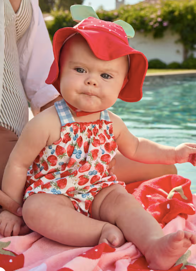 Sweet and sunny, this adorable babygirl set features a charming strawberry 2-piece bathing suit paired with a matching sun hat. The lightweight fabric keeps little ones cool and comfortable, while the playful pattern adds a pop of summer fun!