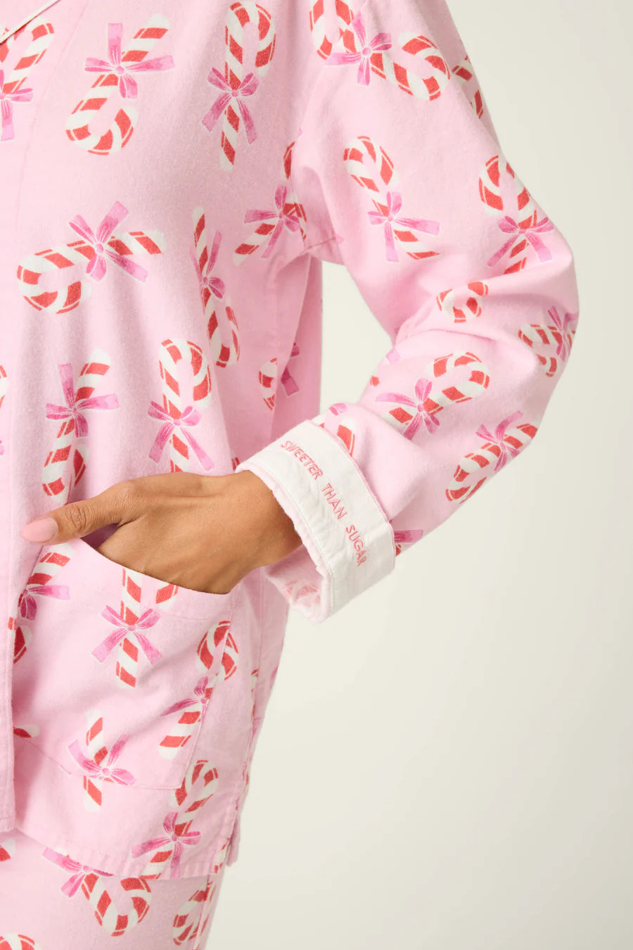 Sweeten your holiday season in this cotton flannel pajama set, scattered with candy canes tied up in pink bows. The three-piece design includes a button-down top with contrast piping, relaxed drawstring pants, and a matching headband—made for movie marathons, peppermint cocoa, and cozy mornings that stretch into afternoons.