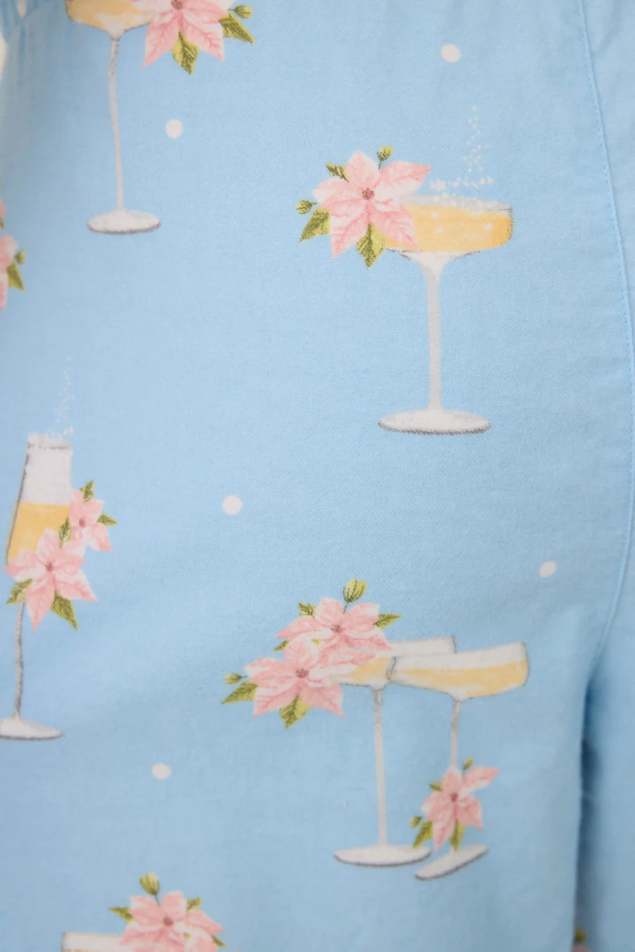 Toast the season in this light blue cotton flannel pajama set, scattered with champagne coupes and flutes topped with festive poinsettias. The button-down top features a relaxed fit and chest pocket, while the drawstring pants have an easy straight leg—made for clinking glasses, cozy mornings, and bubbly nights in.