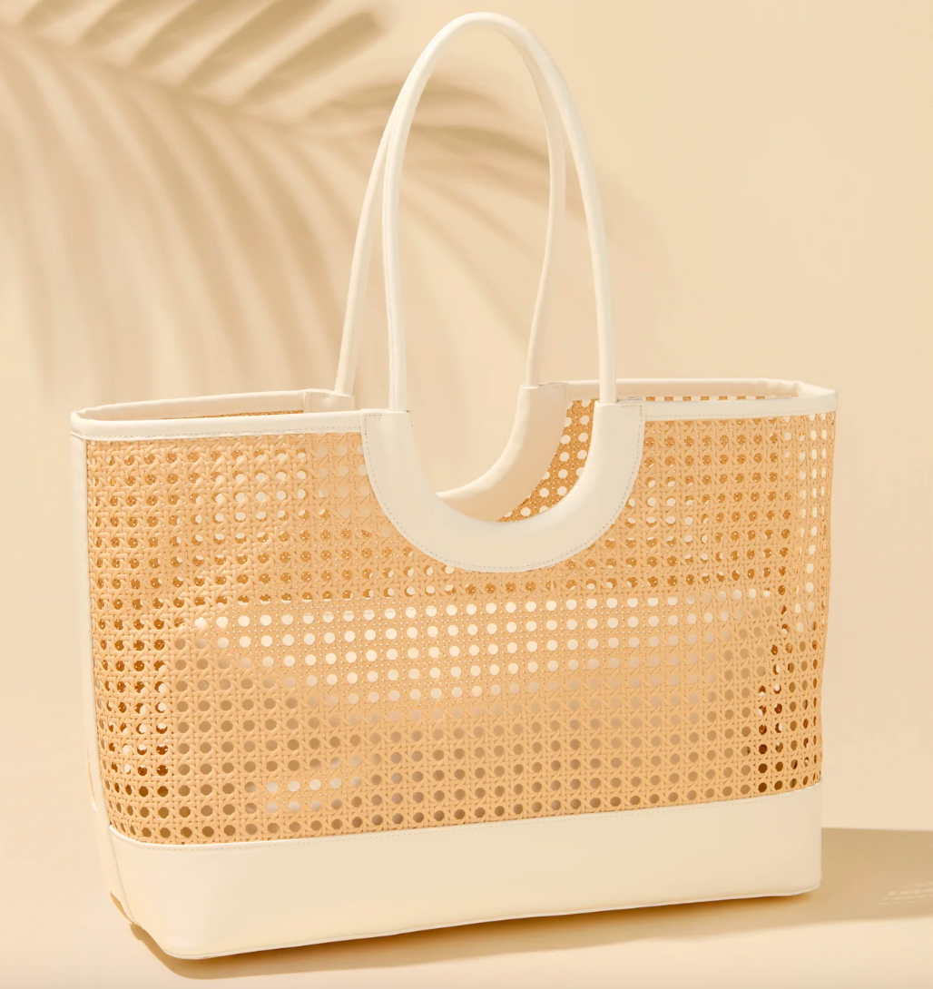 Bring a pop of personality to your warm-weather wardrobe with the Lyra Tote. This standout style features an airy cane-inspired weave, bold vegan leather trim, and double shoulder straps for easy carry. A magnetic snap closure keeps your essentials secure, while a removable zip pouch adds a touch of function to its fashion-forward form. Perfectly sized for beach days, brunches, or weekend getaways, the Lyra Tote blends charm and practicality in one sunny statement.