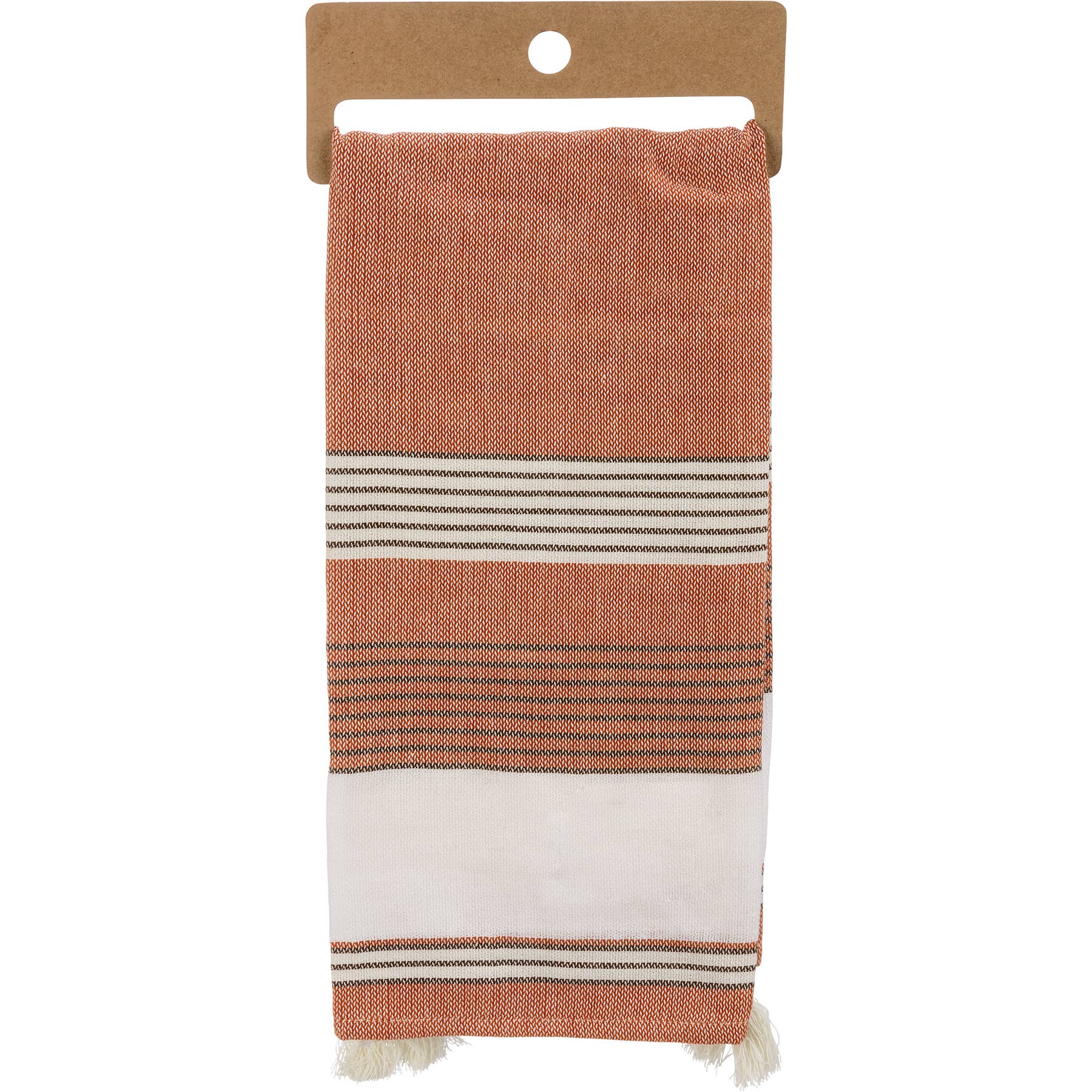 A cotton kitchen towel from our Fall & Harvest Collection features a fall-inspired color palette with embroidered "Feed Me Pie & Tell Me I'm Pretty" sentiment and woven stripe designs. Includes tassel accents for added interest. Towel is packaged on a cardboard hanger to easily display on rack. Our Feed Me Pie & Tell Me I'm Pretty kitchen towel is machine-washable.