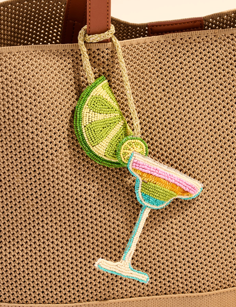Add a splash of fun to your bag with our Lime/Margarita Beaded Bag Charm. Featuring a vibrant green lime slice paired with a pastel margarita glass, this charm brings vacation vibes wherever you go. Detailed with intricate beading and bold tropical flair, it's the perfect finishing touch for your beach tote or everyday carry. With its cheerful design and easy loop attachment, this charm instantly lifts your mood and your style.